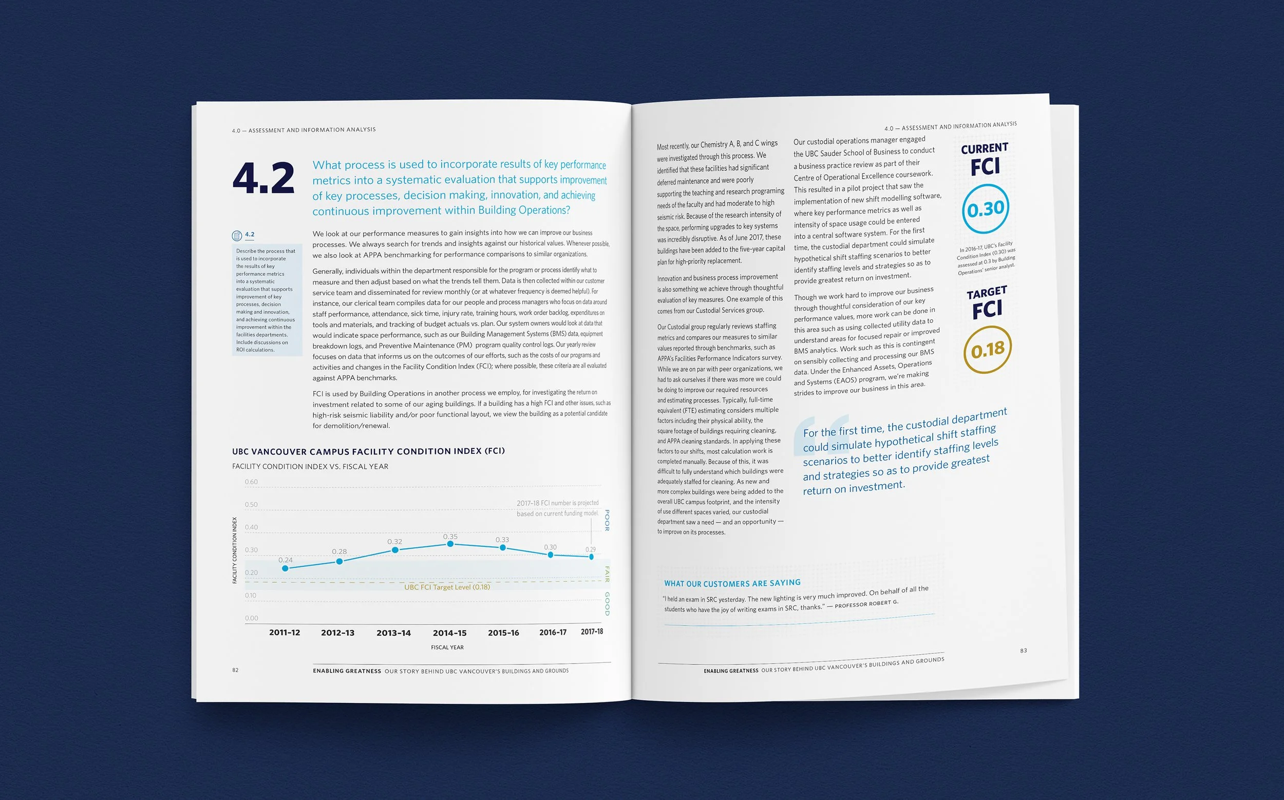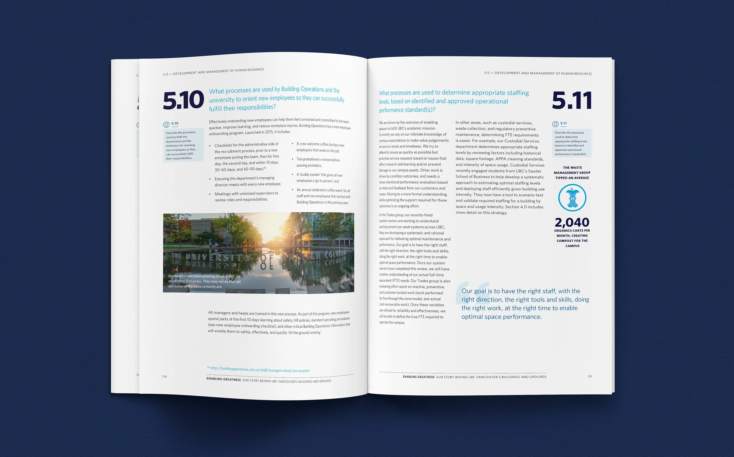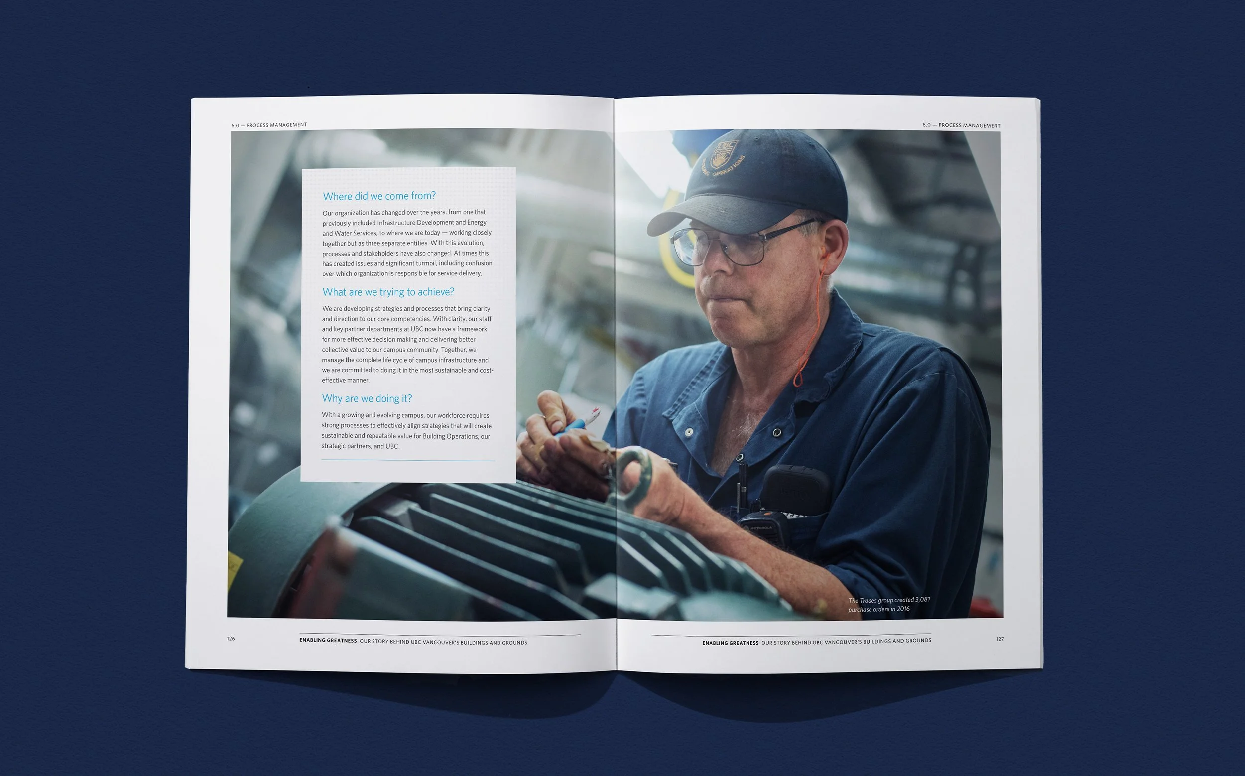 UBC Building Operations participated in the APPA FMEP (Facilities Management Evaluation Program) evaluation process for facilities management excellence. RDC designed and assembled the 170-page book Enabling Greatness: Our Story Behind UBC Vancouver’s Buildings and Grounds, which served a dual purpose as both a formal self-evaluation, as well as a comprehensive overview of Building Operations, its activities, current performance, and future plans.